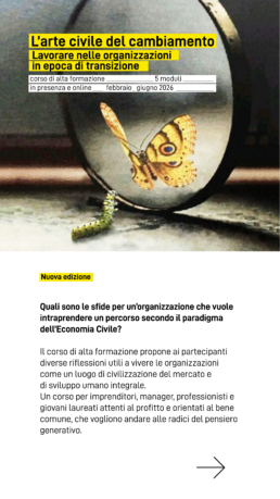 Un percorso partecipato di conoscenza e scambio sull'Economia Civile, che mette al centro la felicità pubblica, i beni comuni e le persone. Rivolto a imprenditori, operatori pubblici e privati, appassionati di scienze economiche e sociali, scuole e università.